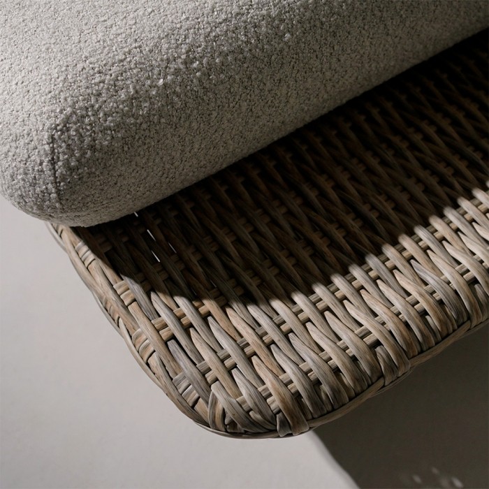 Aluminiowy stelaż lakierowany proszkowo zapewnia odporność na korozję i stabilność konstrukcji przy intensywnym użytkowaniu. Wykończenie technorattanem w formie półokrągłego wickeru wpływa na estetykę oraz zwiększa odporność mebli na zmienne warunki atmosferyczne. Blat z kompozytu MAYO cechuje się trwałością oraz łatwością utrzymania w czystości.