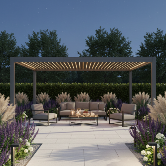Nowoczesna modułowa pergola elektryczna ELITE, przeznaczona do zadaszenia tarasów i przestrzeni wypoczynkowych. Konstrukcja oparta jest na dwóch aluminiowych nogach o przekroju 15 × 15 cm i grubości ścianek 2,2 mm, co zapewnia stabilność przy zachowaniu lekkiej formy. Dach sterowany elektrycznie wyposażony został w 11 aluminiowych paneli dachowych, umożliwiających regulację dopływu światła i wentylacji. Zintegrowane oświetlenie LED z możliwością wyboru barwy światła (białe, ciepłe, neutralne, zimne) zwiększa funkcjonalność pergoli po zmroku. Całość obsługiwana jest za pomocą pilota, który steruje zarówno dachem, jak i oświetleniem.