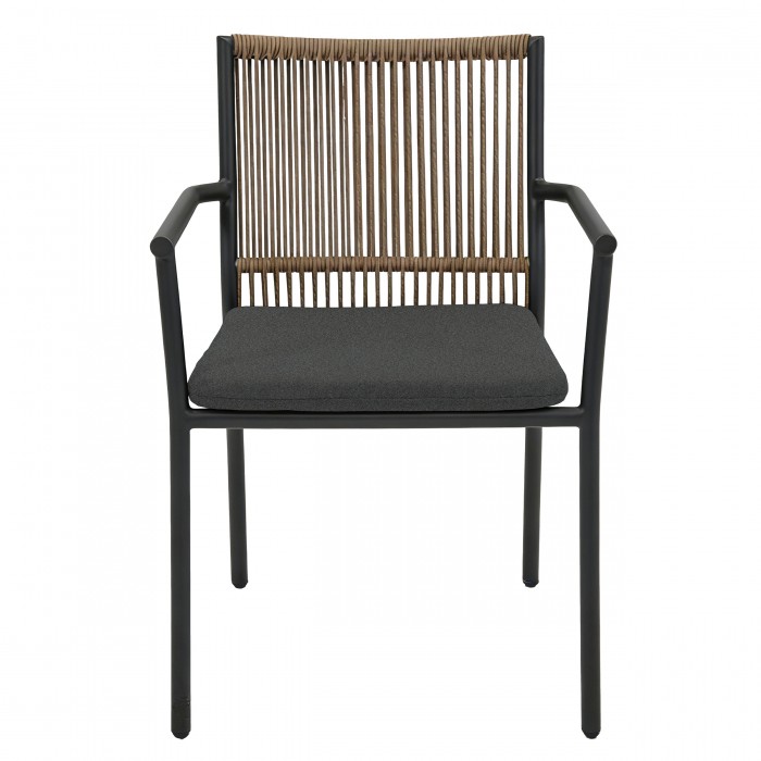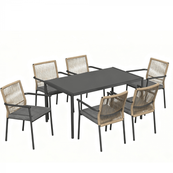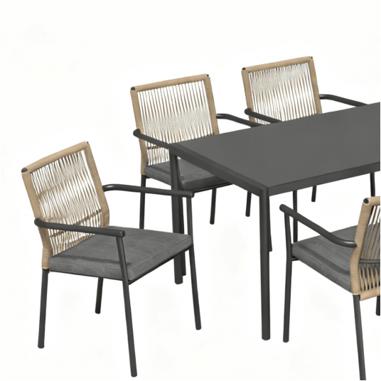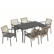 Zestaw jadalniany VENCE składa się ze stołu oraz sześciu krzeseł z podłokietnikami, przeznaczonych do użytkowania w ogrodach, na tarasach oraz w strefach gastronomicznych. Klasyczna forma w połączeniu z funkcjonalnym układem pozwala na komfortowe użytkowanie zarówno w przestrzeniach prywatnych, jak i komercyjnych.