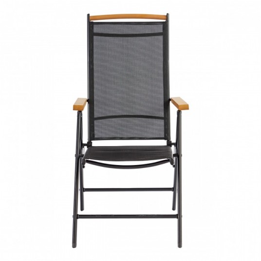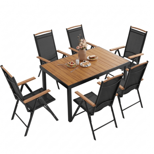 Liczba miejsc: 6 osób Skład zestawu: stół + 6 krzeseł Materiał konstrukcji: aluminium malowane proszkowo Blat stołu: kompozyt drewnopodobny Materiał oparcia krzeseł: texteline 2×1 Regulacja oparcia krzesła: 7 pozycji