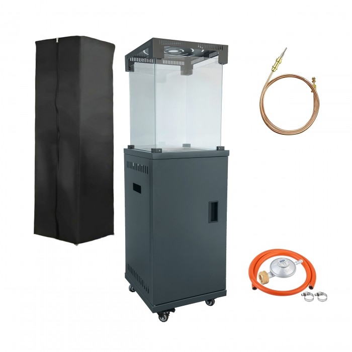 Typ paliwa: gaz ziemny / LPG Całkowita wysokość: 140 cm Wymiary podstawy: 40 × 40 cm Wymiary szkła: 47 × 47 cm Dolne wsporniki: 4 szt. (900 × 400 mm) Osłona przeciwwiatrowa: szklana W zestawie: 3 kg skały lawowej, wąż, regulator Kolor: antracyt